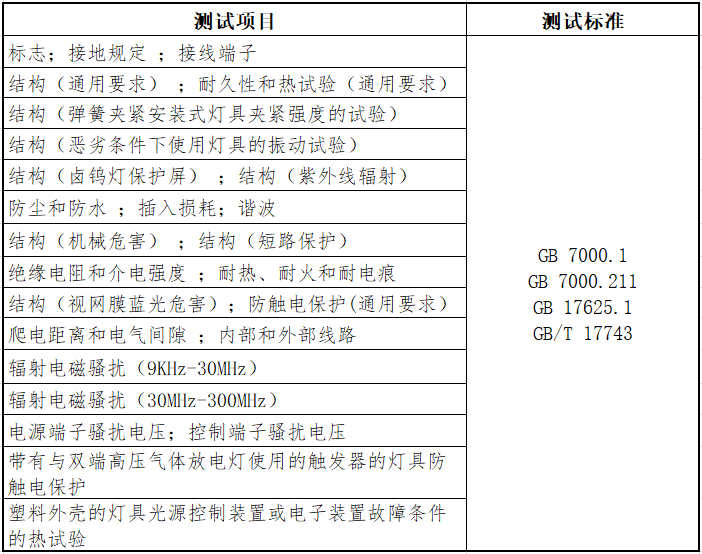 测试项目与标准
